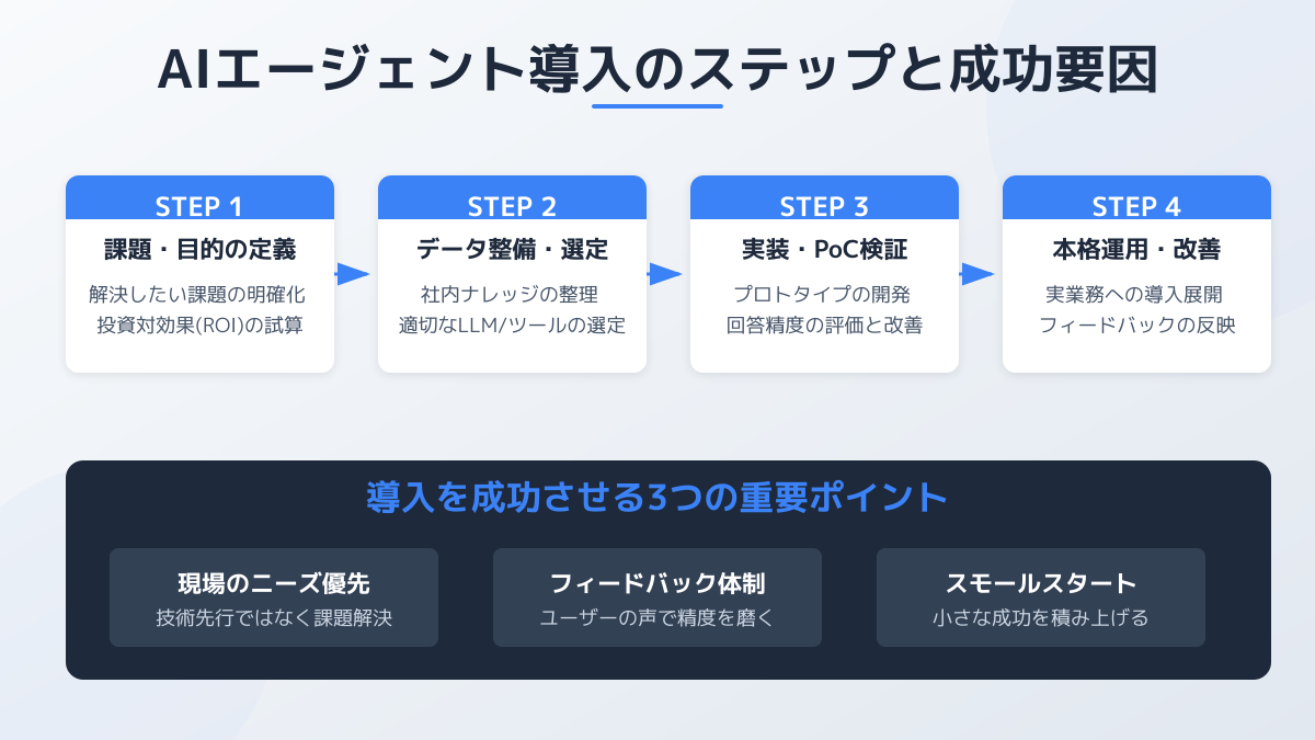 実際の導入プロセスにおいては、最初から大規模なシステム構築を目指すのは避けるべきです。特定の業務に限定したスモールスタートで効果を検証し、徐々に適用範囲を広げていくアプローチが失敗リスクを低減します。